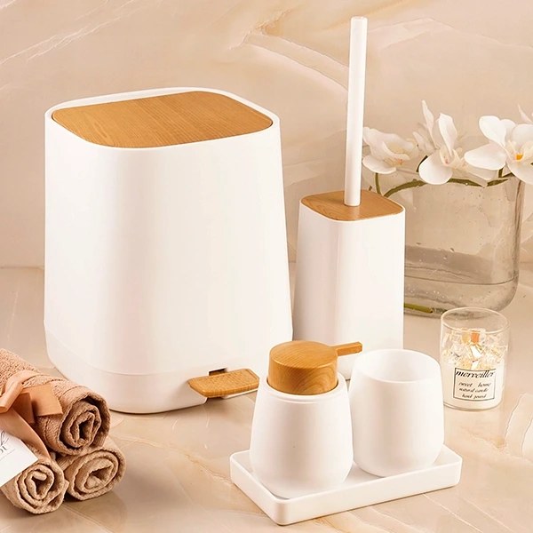 ست به صورت 5پارچه میباشد/درب کار به صورت پدالی و دارای سطل دوجداره و درب آرام بند/جنس محصول پلاستیک فشرده